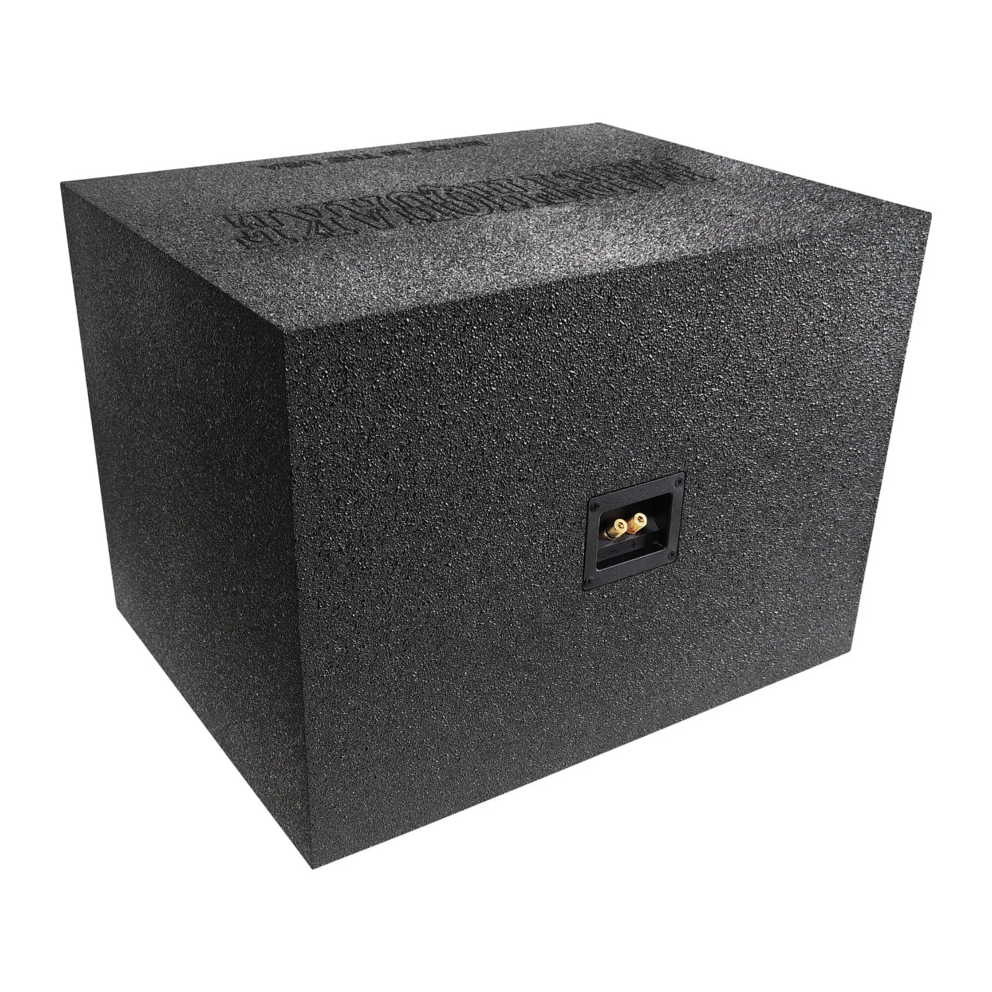 Earthquake Sound introduces its new line of single and dual mobile audio subwoofer enclosures. Crafted from 3/4ʺ particle board, the RB1 pump enclosure is CNC machined to precision and assembled in house for the utmost in quality and performance. They are made to accommodate most 12 and 15 inch Earthquake subwoofers as well as other subwoofers on the market today. Featuring the state-of-the-art patented passive system, the PUMP-12, these enclosures maximize SPL output at low frequencies. The exterior of this all new line of enclosures are finished with a black spray-on textured polyurethane bedliner material giving them a rugged yet extremely durable look. These subwoofer enclosures are only available as preinstalled loaded units with DBXI or MAGMA drivers with wiring terminals included.