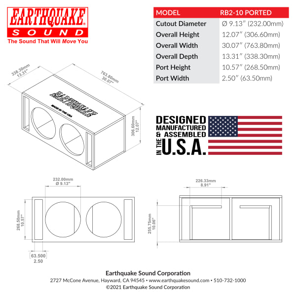 Earthquake Sound introduces its new line of single and dual mobile audio subwoofer enclosures. Crafted from 3/4ʺ particle board, these enclosures are CNC machined to precision and assembled in-house for the utmost quality and performance. They are made to accommodate most 10 and 12-inch Earthquake subwoofers and others on the market today. The exterior of this all-new line of enclosures is finished with a black spray-on polyurethane textured bedliner material, giving them a rugged yet extremely durable look. RB2 subwoofer enclosures are available as preinstalled loaded units with either TNT or TremorX drivers with wiring terminals included.